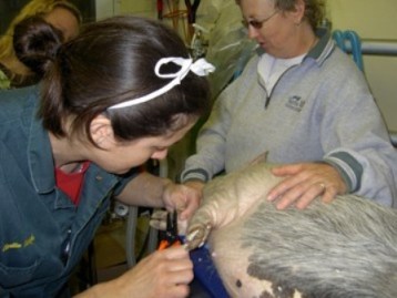 I'm at the Battenkill Bovine Hospital with Dr. Emilie, and Toni! Toni is my anesthesiologist. She's incharge of me sleeping through this whole thing...and then waking up after. That's alot of responsibility! I've been sucking gas through a clear plastic cup...with a hose attached to it! The hose is connected to different gas tanks...and there's a black baloon going in and out as I breath. Everybody's watching it. I'm laying on the table...on my back...in a foam thing. My front feet are "hog tied". I feel like I'm floating! I can see everything happening... just like I'm looking down at me from the ceiling!