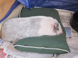 | Yes! Pigs are smart! I learned how to use my nose to flip the lid off the food bucket! Lets hope Dottie isn't so smart as to put it where I can't get to it! |  |