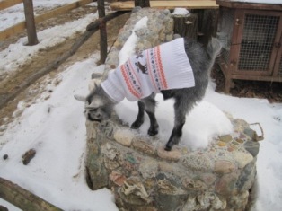 | It's my new sweater! Dottie puts it on me so I can go outside. It's way to cold for me...I'm just a kid! She said next year I'll have thick fuzzy fur just like you guys, and I won't need a sweater! |  |