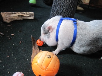 | Dottie gets her exercise...cleaning up after me! She brings out all my toys...and tosses a handful of pellets on the floor! I find every one of them! I have to move my toys around to do it! |  |