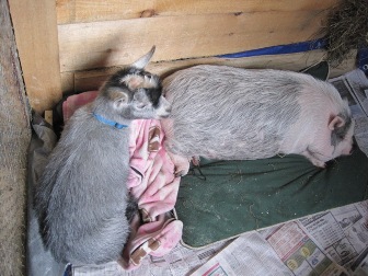I mean...really now! Can you believe the "pig" has the run of the house? She even has a bigger litter box than us cats! The nerve! And to top it all off...she acts more like a dog...than the dog! Go figure! Ha! |  |